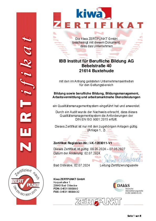 Als erster Bildungsträger in Deutschland wurde unser Institut 1996 nach DIN ISO 9001 zertifiziert. Seither entsprechen wir dieser anspruchsvollen Qualitätsnorm. Seit 2006 ist das IBB als Träger auch nach den Vorgaben der AZWV und seit 2012 der AZAV zertifiziert.